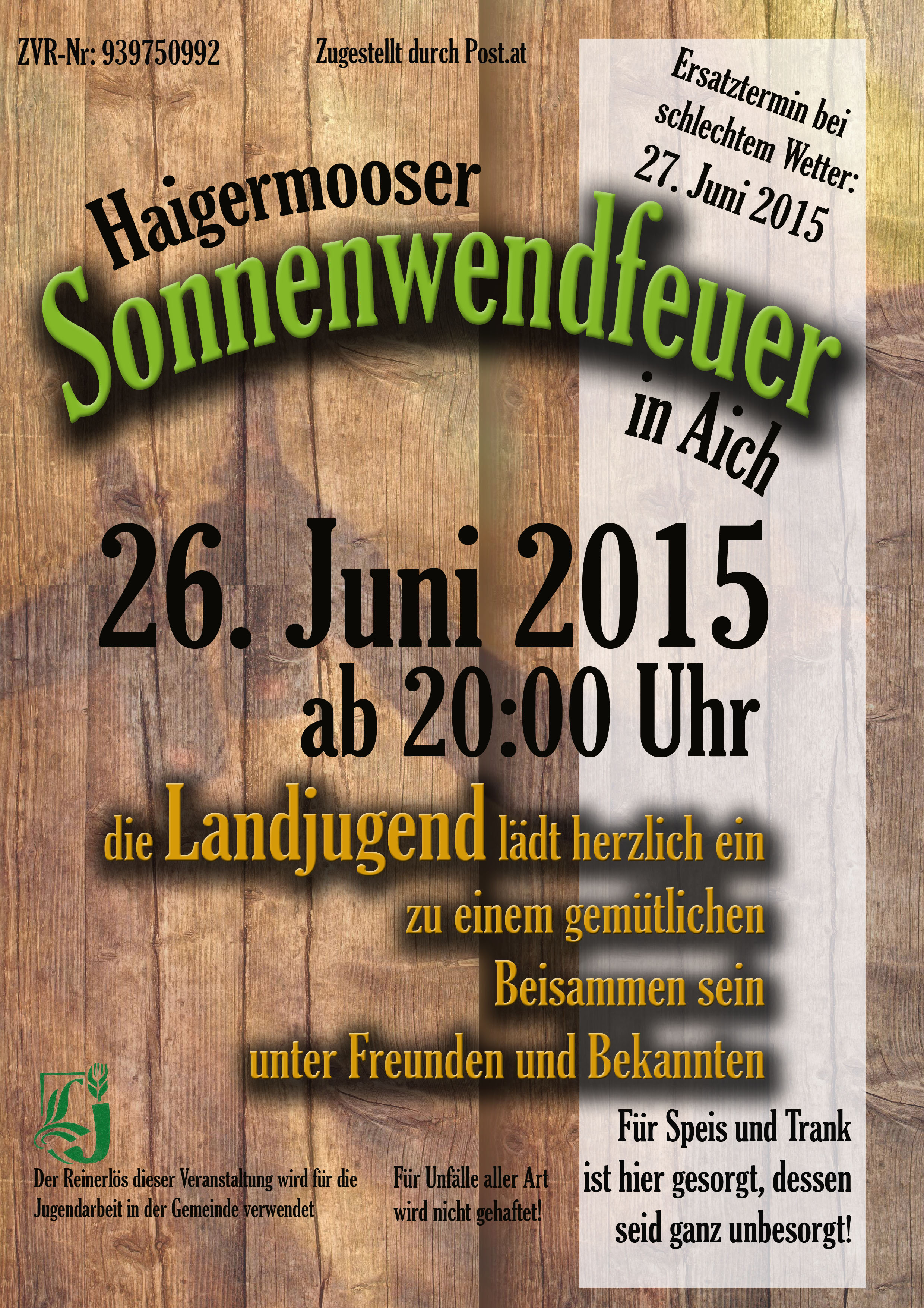 Veröffentlicht am 26. Juni 20156. März 2016 von Landjugend HaigermoosSonnenwendfeuer heute Abend! Jetzt geht’s bald los. Juhu, das Wetter könnte für einen solchen Anlass nicht besser sein. Die Landjugend freut sich schon auf euch! Wir sehen uns dann später,